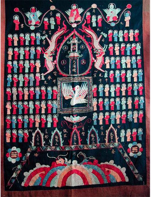 I motivi che sono ricamati sulla veste,(eseguiti con filo di seta) rappresentano il Paradiso dei Taoisti (the Heavens of the Taoist stellar gods) oltre ad altri simboli della religione taoista.